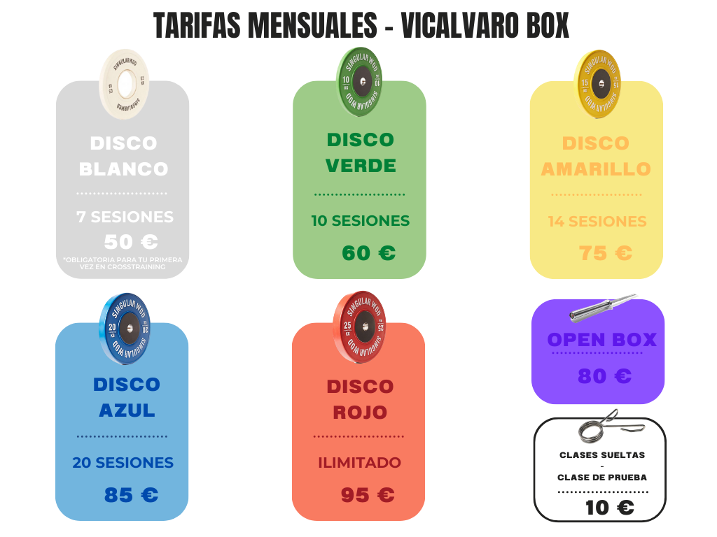 * Si gastas tus sesiones antes de que acabe el mes puedes pagar la diferencia con la siguiente tarifa y obtendrás la diferencia de sesiones. Ejemplo: terminas la tarifa disco verde y pagas 15€ para subirte a disco amarillo y obtener 4 sesiones más.